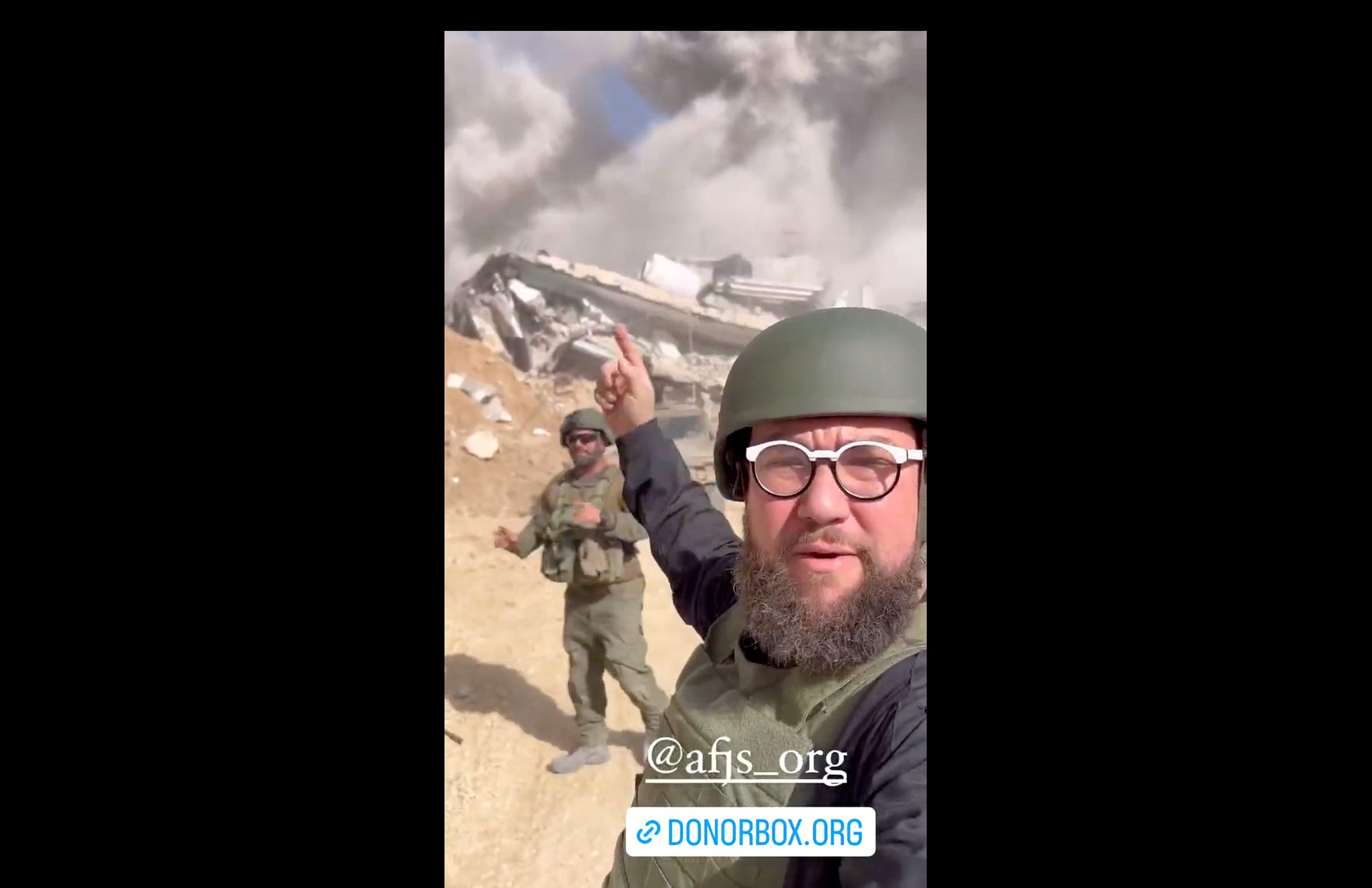 Gabriel Boxer, the “Kosher Guru,” in a video showing destruction in Gaza and promoting donations to American Friends of Judea and Samaria. Source: Instagram.
