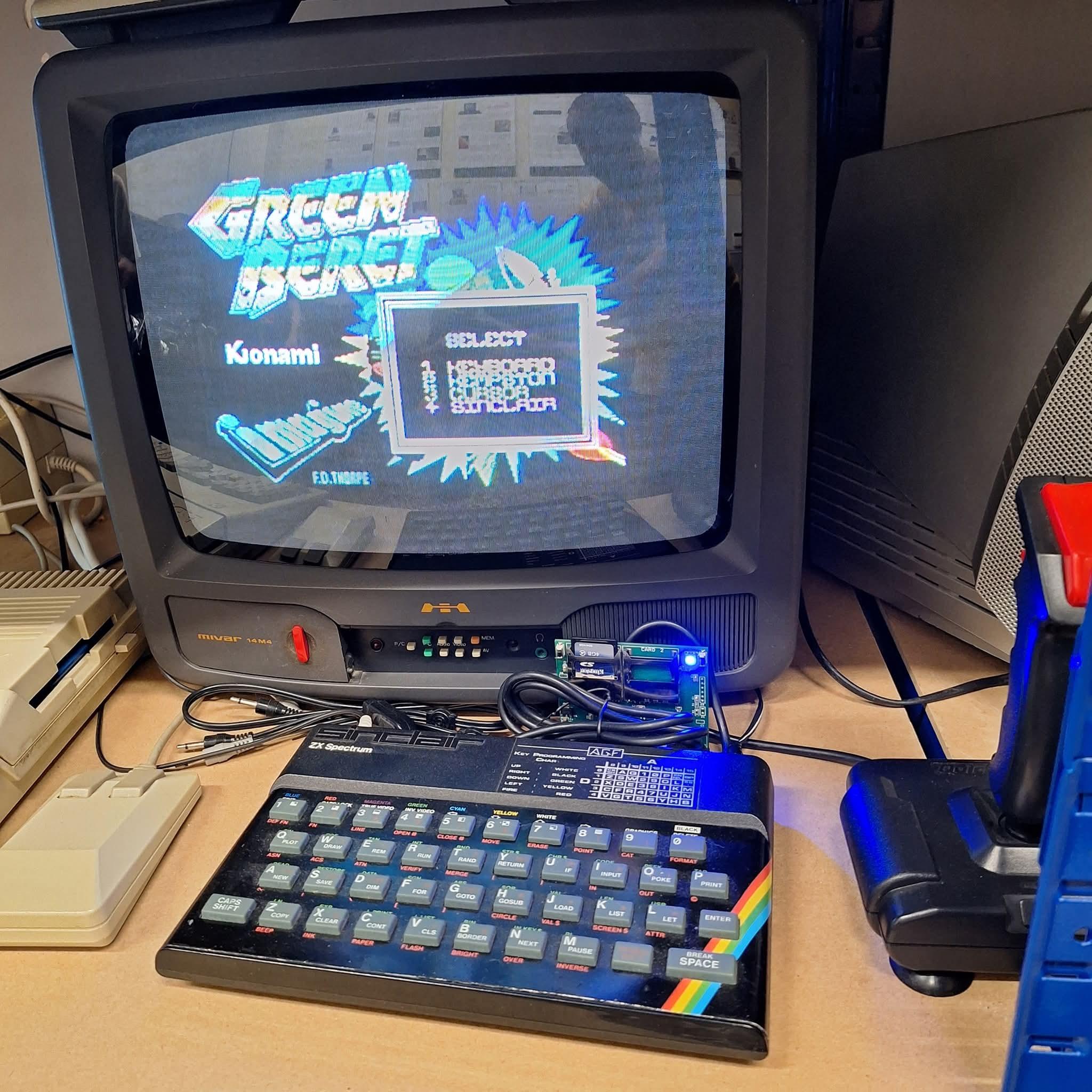 Nello scaffale di Apulia Retrocomputing, subito a sinistra dell’Olivetti Prodest PC128, è mostrato mentre esegue Green Beret della Konami, con interfacce DivMMC (per caricare da SD) e Kempston (per joystick).