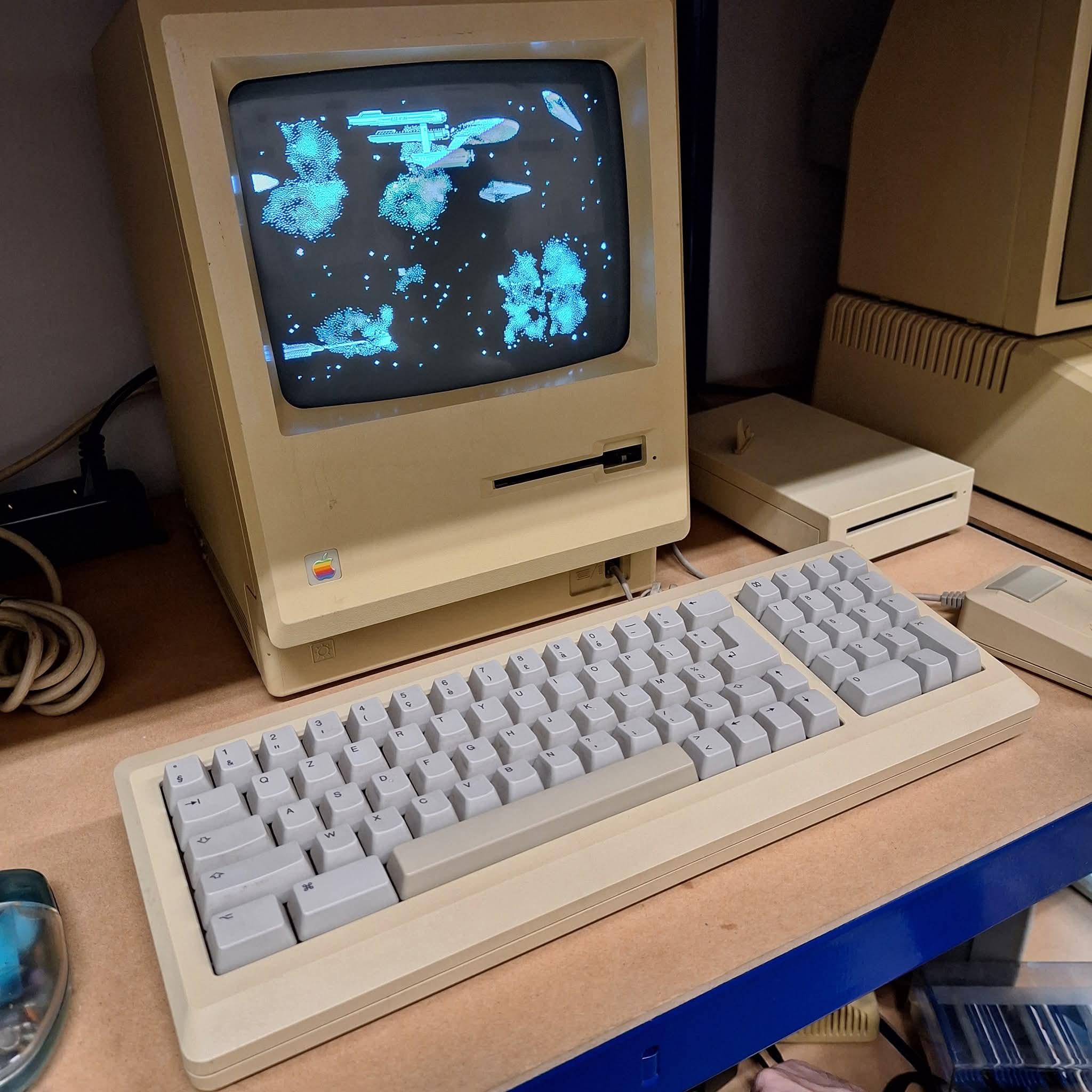 Nello scaffale di Apulia Retrocomputing, a sinistra dell’Apple IIe, è esposto con floppy esterno e mouse. In foto esegue uno screensaver, segno delle potenzialità che lo resero simbolo di creatività e comunicazione visiva.