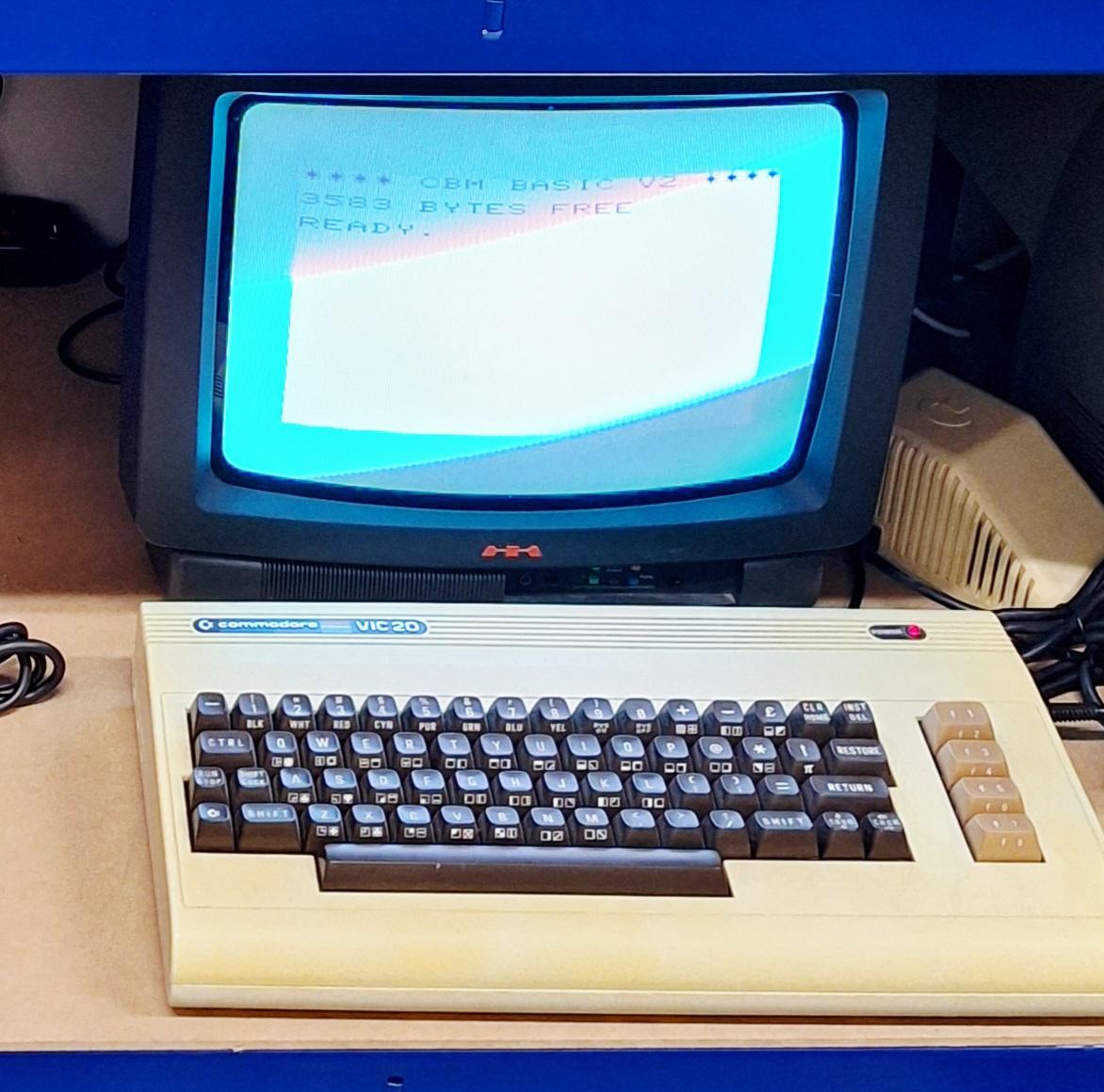 Nello scaffale di Apulia Retrocomputing, subito a sinistra del Commodore VIC-20, è esposto con la schermata del BASIC.
