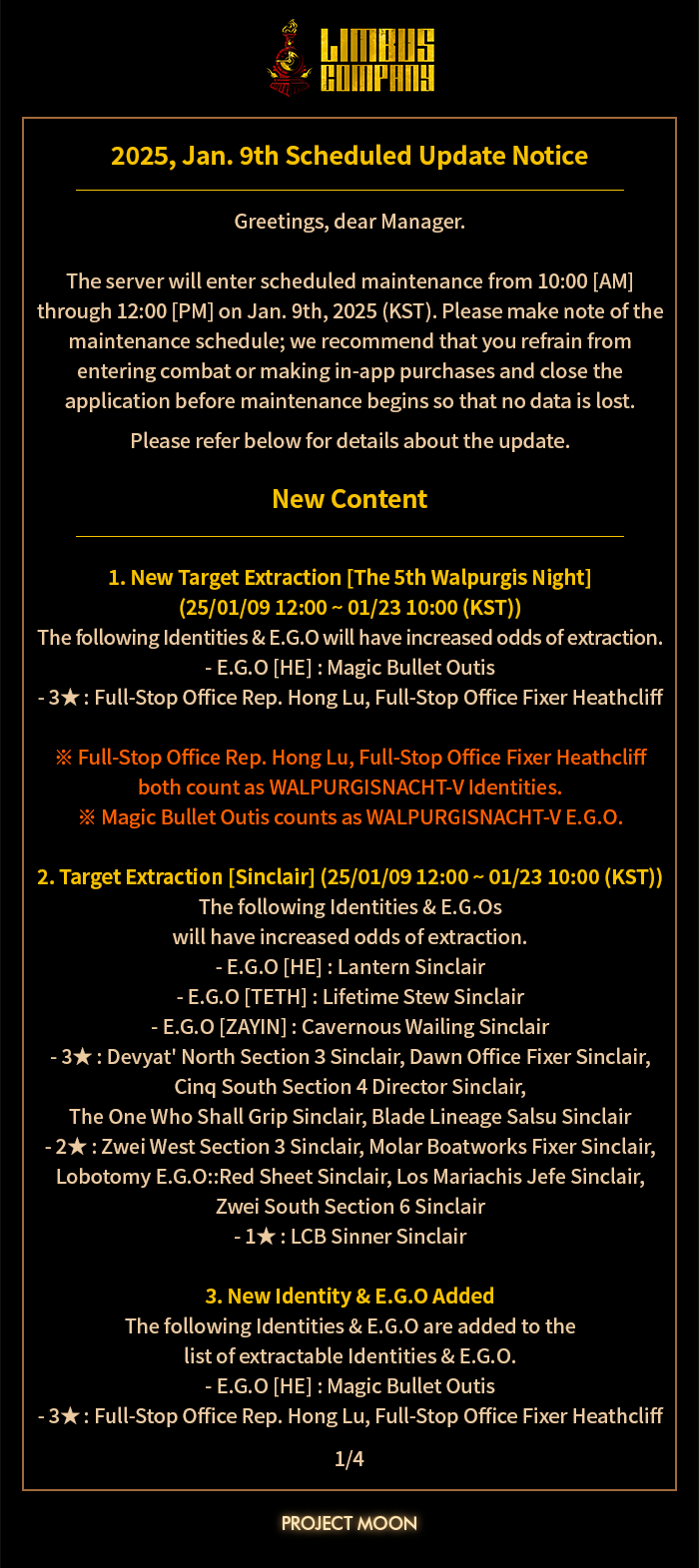 [Limbus News] Notice: Jan. 23rd 2025 (KST) Scheduled Update Server Error Fixed