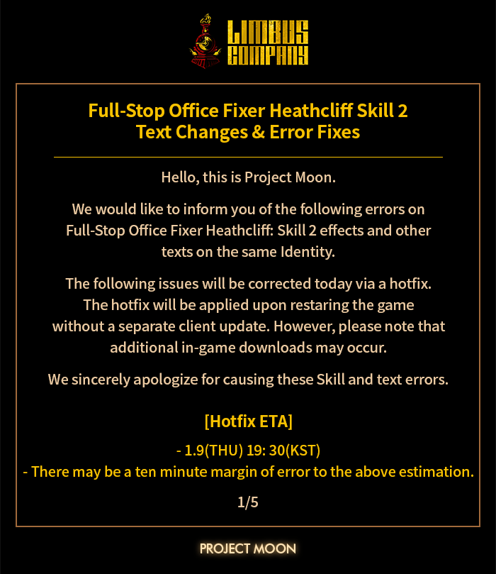 [Limbus News] Notice: Full-Stop Office Fixer Heathcliff Skill 2 Text Changes & Error Fixes