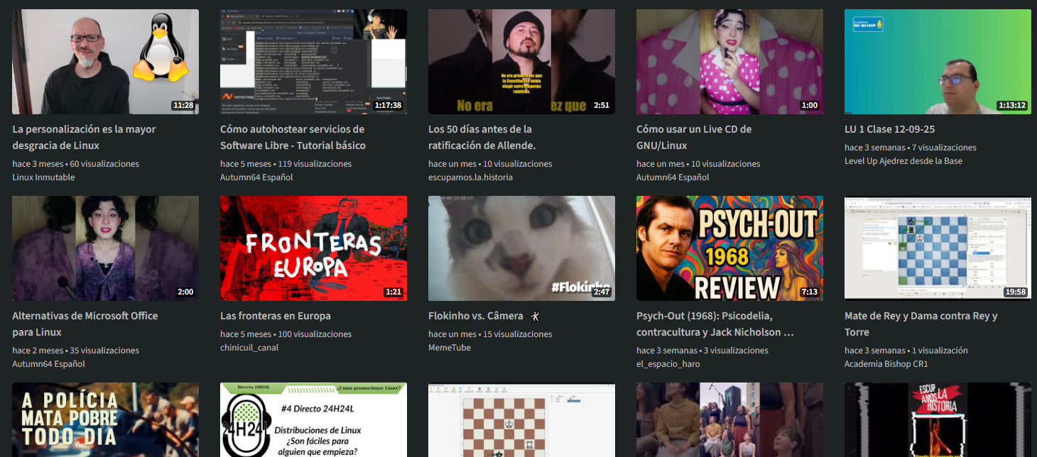 Jajaja, fuera de chiste: lo poco que exploré es contenido de protesta, ajedrez y software libre. Si buscas "chile" todos los videos son de hace 3 a 4 años y todos tratan sobre el estallido social, pues ahí ya hay que entrar a variar el menu o aguantarse