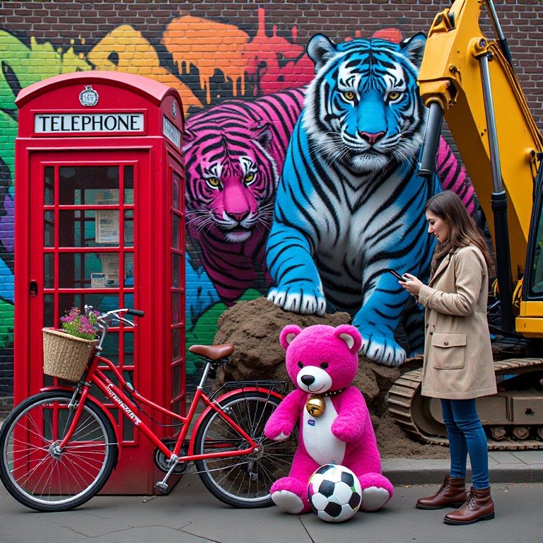Standing prominently in front of that painted wall is an iconic, British-style bright red cast-iron telephone booth. The glass panels are slightly dusty, and the heavy translucent TELEPHONE sign is illuminated from within. Inside the booth, can clearly see an old rotary phone apparatus and a tattered phone book hanging by a metal chain.